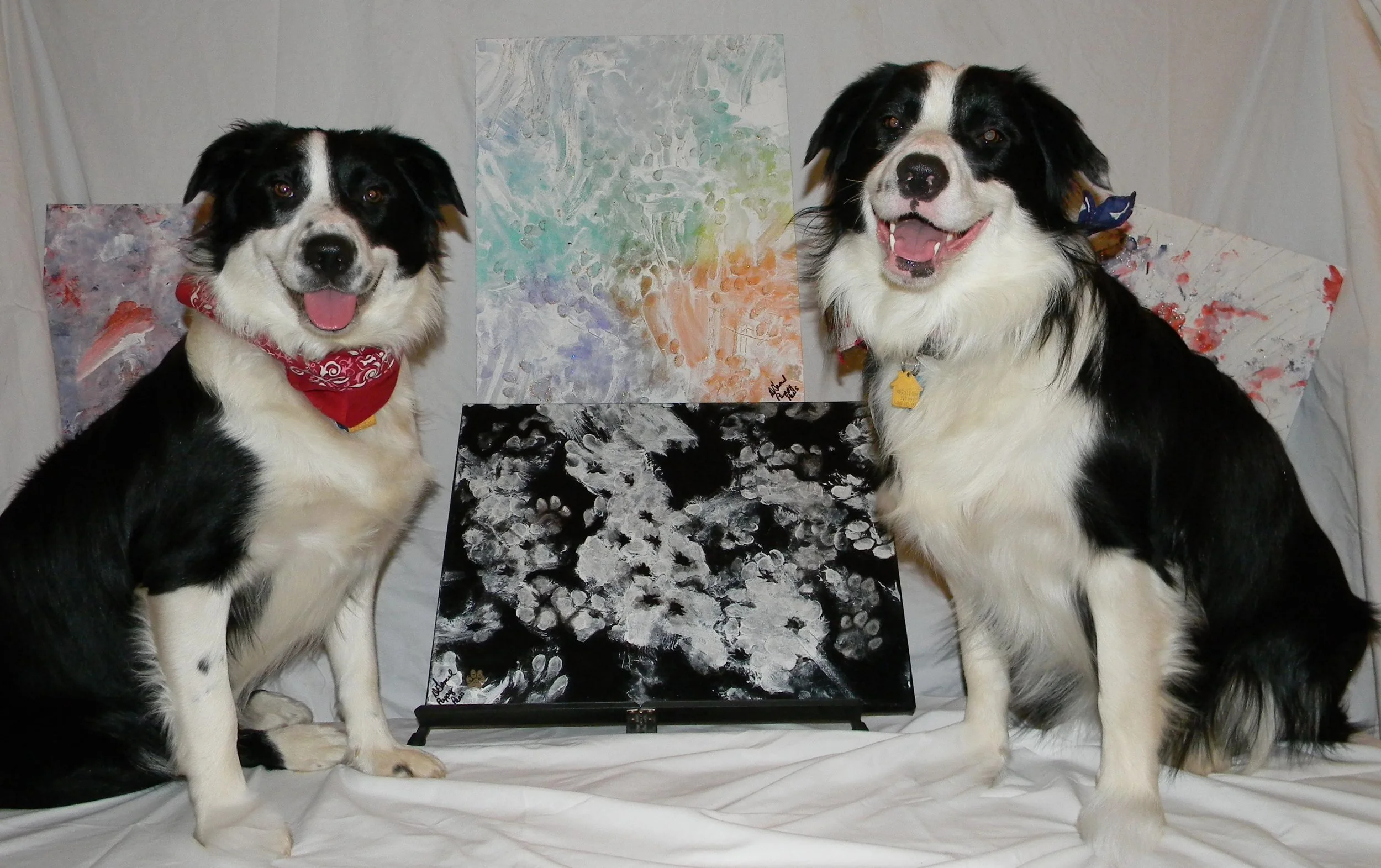 Abby and Jazz are my Border Collies, and these young pups that have taken up painting! Their "just-for-fun" paintings are all originals — each one unique and never duplicated. Their paintings are also benefiting others not only through donations to local veterinarian clinics that have made a great impact on our family's lives, but also to the Greater Birmingham Humane Society for their 2018 Jazz Cat Bell Charity auction!